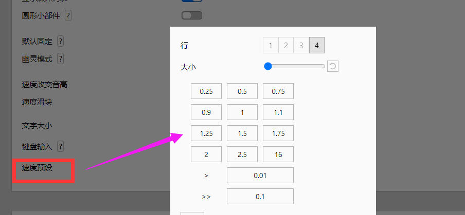 先是选项卡,在这里可以看到一些基本的设置,主题颜色、显示徽章、显示指示器等等,基本都是一些关于界面,按钮之类的个性设置。在“速度预设”里大家可以设定一个适合自己的,因为有些时候,根本用不到那么多倍速的。
