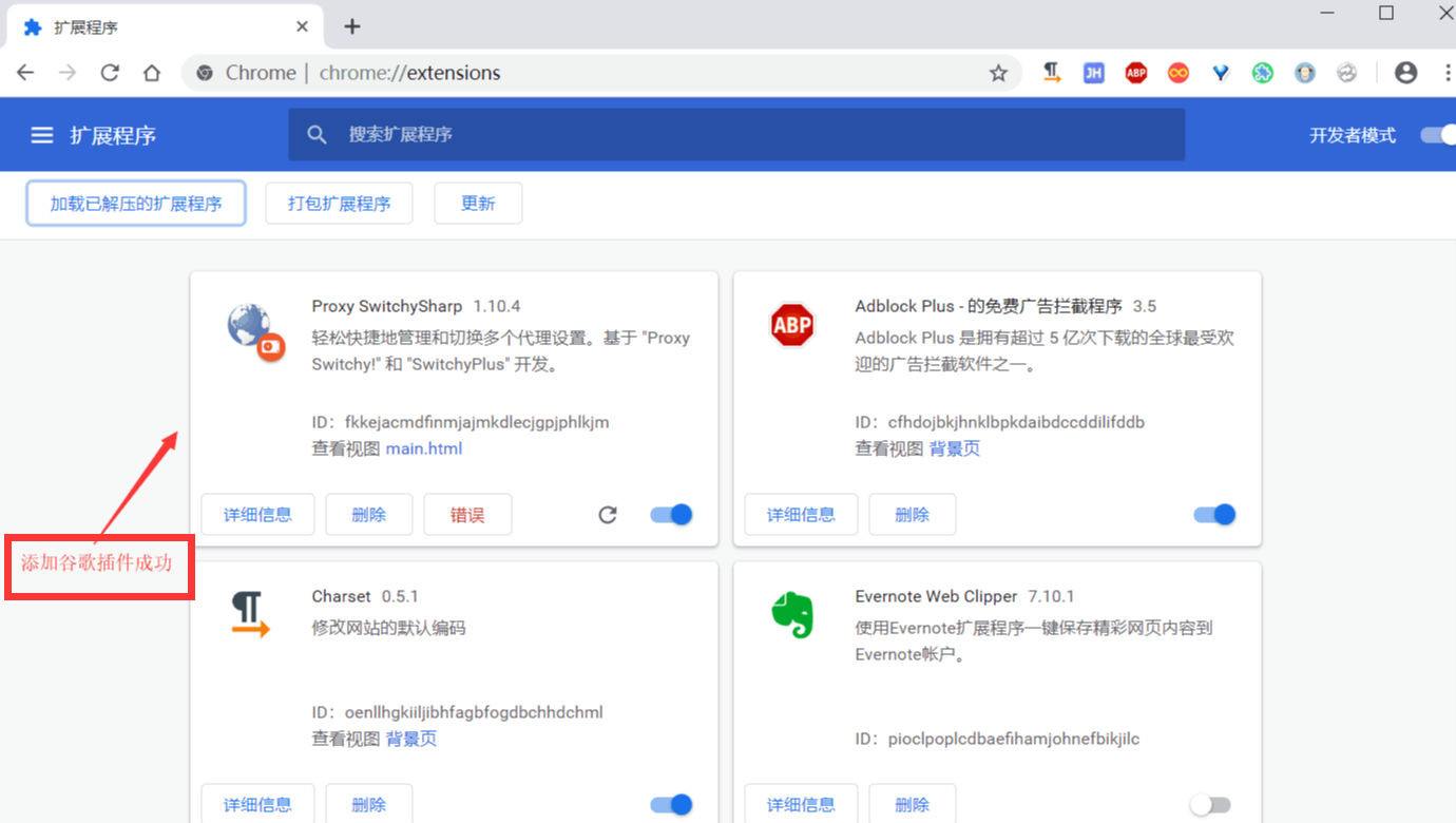 4、在右上角有个开发者模式,点击启用,然后在点击 “加载已解压的扩展程序”按钮,找到你解压谷歌插件压缩包的文件夹的位置,点击 “选择文件夹”按钮