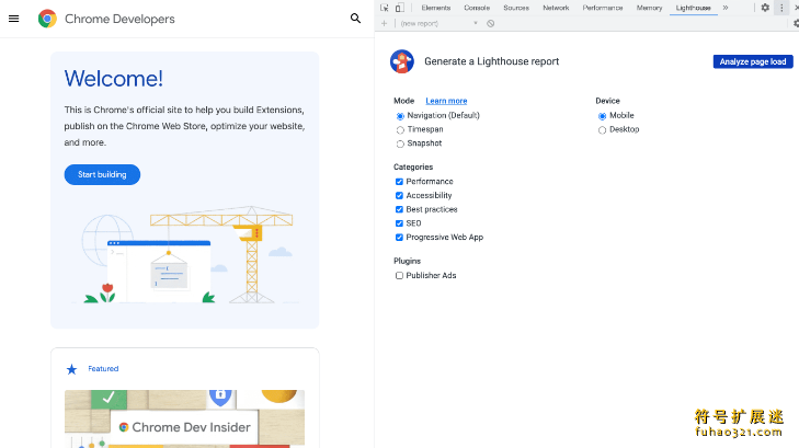 Lighthouse 在 Chrome DevTools 中拥有自己的面板。要生成报告,请执行以下操作: