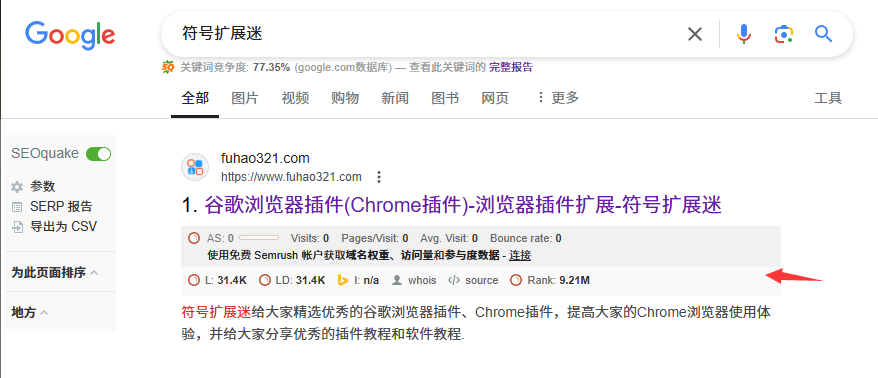 5.我们安装完毕后,打开一个网页,我们这里也用www.fuhao321.com为例子,点击右上角的ICO插件图标,就会弹出一个SEO数据信息框