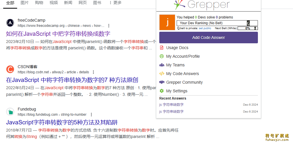 4、搜索引擎的搜索结果中有代码的地方,我们会看到右上角多出来了Grepper的图标