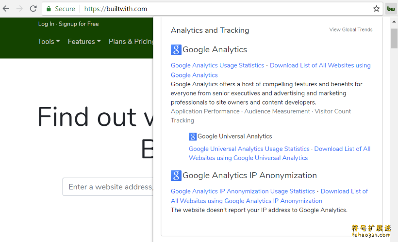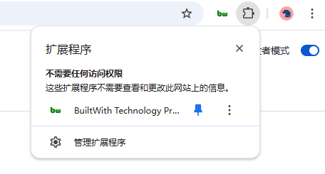 2、点击浏览器右上角的BuiltWith插件图标,插件会自动从BuiltWith的官方资料库中检索当前网页的数据