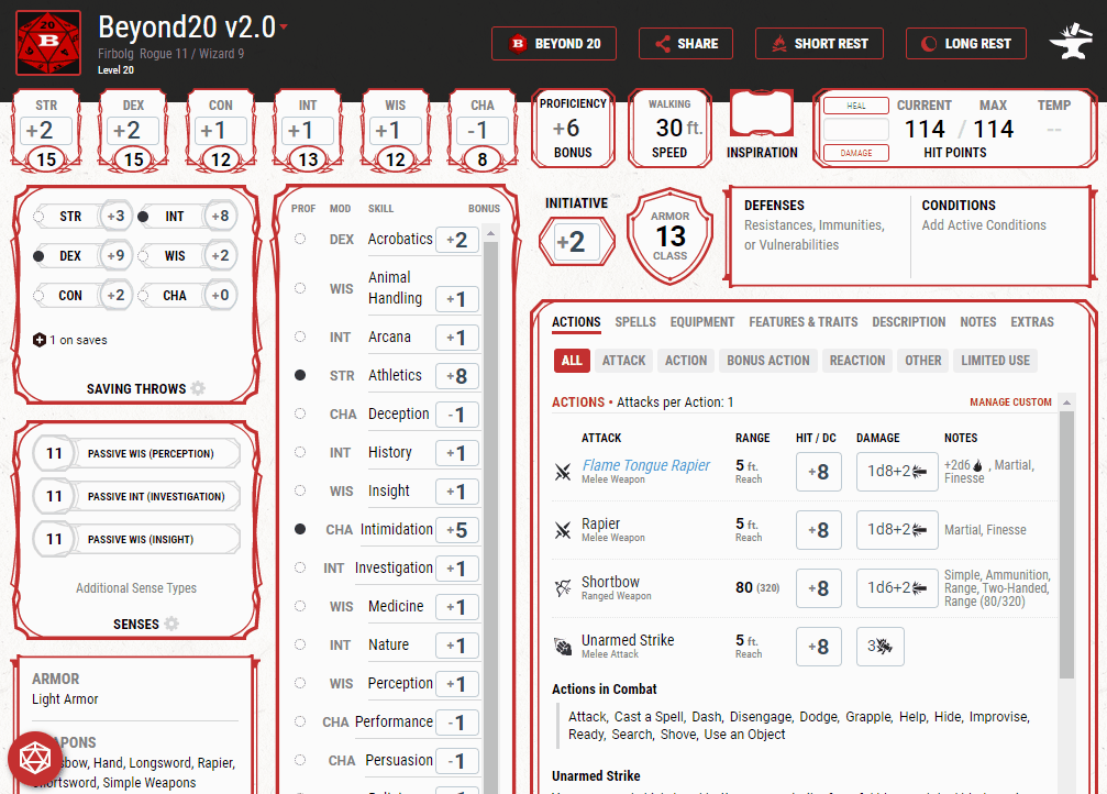 这显示了 Beyond20 (v0.3) 在 Firefox 上运行并将掷骰结果发送到 Foundry VTT。请注意,掷骰结果详细信息在鼠标悬停时显示为工具提示,咒语卡和武器描述在攻击中也可以展开/折叠。