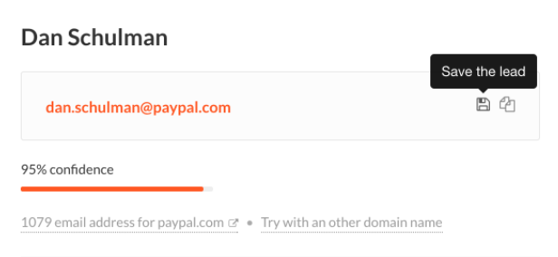 如果您已经知道想要联系的人的姓名,请在搜索字段中输入该姓名。电子邮件查找器将返回找到的电子邮件地址以及置信度分数和来源。