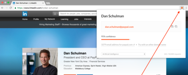 5、Hunter的扩展程序可用于在LinkedIn上查找特定配置文件的电子邮件地址。