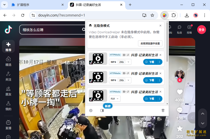 经过测试,小编发现这个插件并不能下载爱、腾、优等国内的视频站视频,但是它居然可以下载抖音里的视频,我们看下具体用法