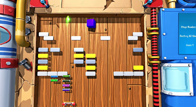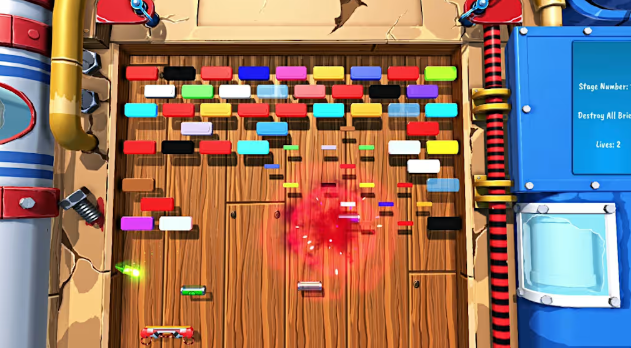 这是一款经典的打砖块游戏,你需要操控一艘战舰发射小球,击碎屏幕上方的所有砖块才能过关。
