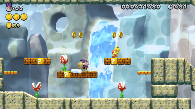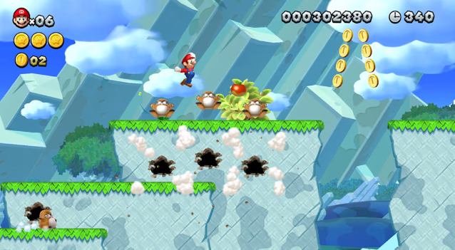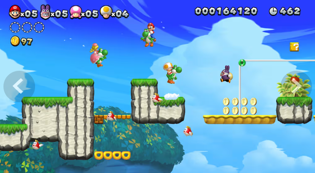 这款游戏的核心玩法是马里奥系列标志性的横版卷轴闯关,玩家需要操控选定的角色在关卡中不断前进,躲避各种类型的障碍物,击败挡路的敌人,收集散落在关卡各处的金币和实用道具,最终抵达关卡终点的旗杆处,完成该关卡的挑战。游戏保留了系列经典的道具系统,比如能让角色变大、抵御一次伤害的超级蘑菇,能发射火球攻击敌人的火焰花,能让角色获得飞行能力的超级树叶,还有能让角色短暂无敌、快速清理敌人的无敌星星等,这些道具不仅能帮助玩家轻松应对难缠的敌人,还能在关键时刻帮助玩家突破复杂的地形障碍,为闯关提供更多策略性。同时,《新超级马里奥兄弟U豪华版》还新增了几款实用道具,进一步丰富了玩法选择,让闯关过程有了更多可能性。