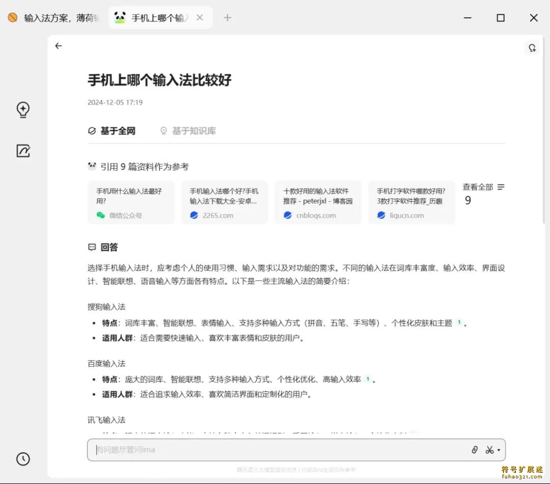 ima的问答模式包括“基于全网”和“基于知识库”两种。前者利用全网信源,尤其是腾讯系产品的优质内容,提升答案质量。针对专业领域,还支持“深度研究”,从广度和深度拓展问题,提供结构化回答,并支持生成脑图。