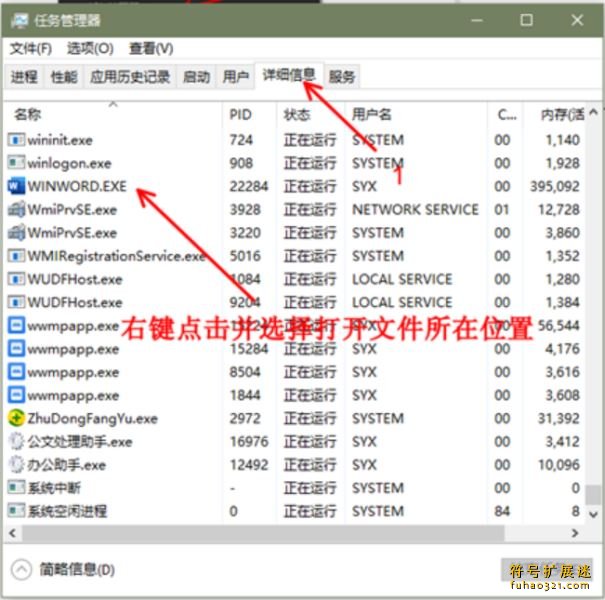 第4步:右键点击“Winword.exe”进程,选择“打开文件所在的位置”或选择“属性”;