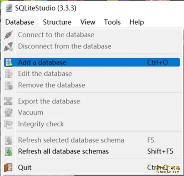 第1步:运行 SQLiteStudio,选择 Database/Add a database 菜单项。