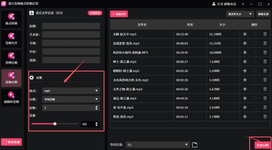 第一步:添加音频文件后,在属性设置区调整格式、分割方式、分割数和音量等参数。
