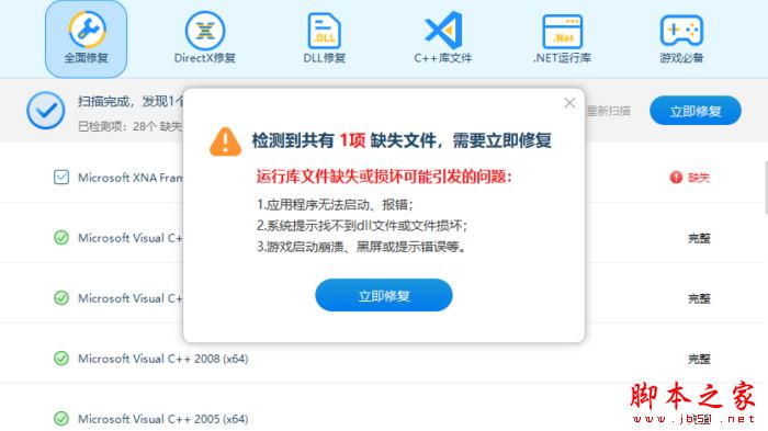 1. 支持Windows 7、10、11系统,检测并修复缺失、损坏或过时的运行库文件,集成最新DirectX Redist(包括DirectX9、10、11、12),解决游戏启动报错、软件崩溃等问题,如0xc000007b、0x00000ba等错误代码。自动适配系统,修复异常dll文件和VC++组件,解决版本错误或文件缺失问题,如XINPUT*.DLL、D3DX9*.DLL等。